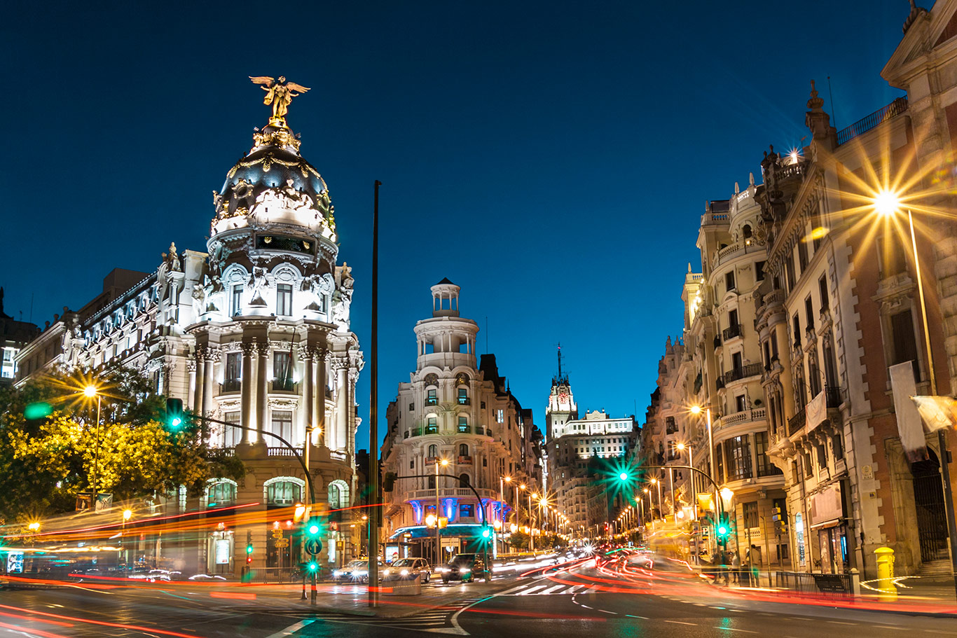 Gran Vía i budynek Metrópolis. Reprezentacyjna ulica Madrytu, nazywana Broadwayem stolicy, zachwyca monumentalną architekturą z początku XX wieku i neo instalacjami świetlnymi. Spacer Gran Vía to spotkanie z luksusowymi hotelami, teatrami grającymi światowe musicale oraz gigantycznymi salonami mody. Na jej wschodnim krańcu wznosi się ikoniczny budynek Metrópolis z charakterystyczną kopułą pokrytą złotem, który jest najczęściej fotografowanym obiektem architektonicznym w mieście. To tętniąca życiem arteria, która najlepiej oddaje wielkomiejski i kosmopolityczny charakter Madrytu.