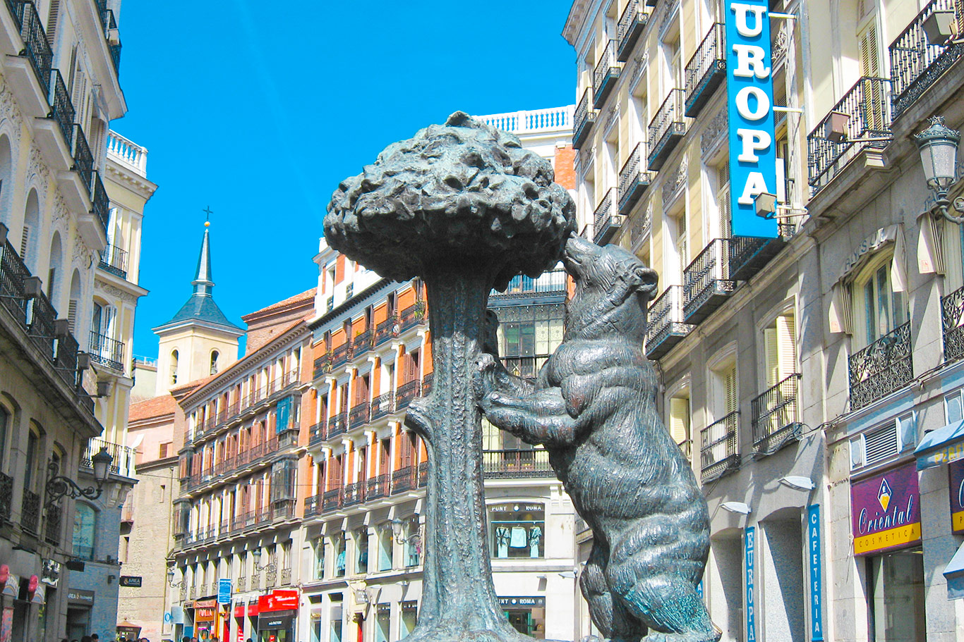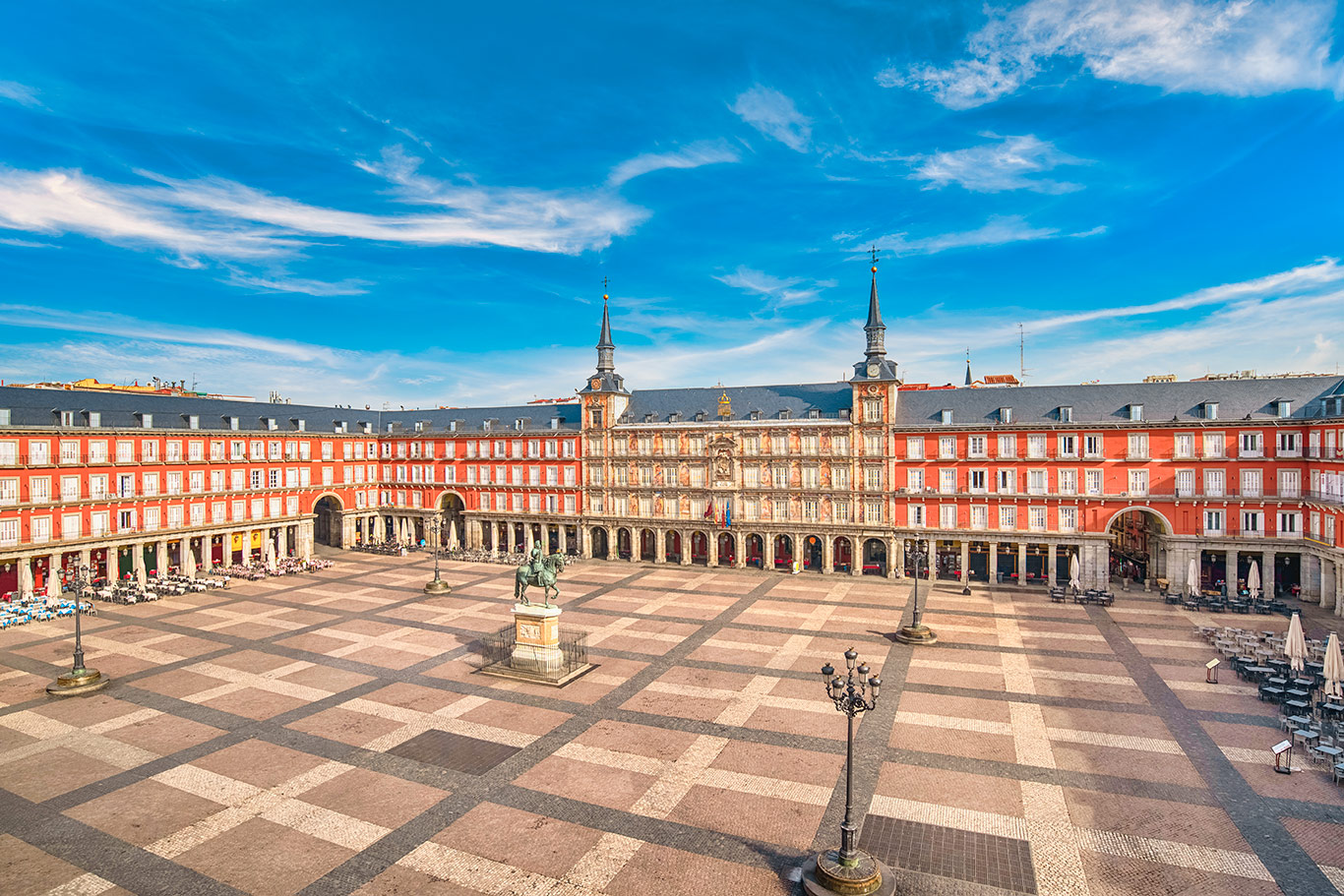 Plaza Mayor. Główny plac Madrytu, otoczony symetrycznymi, czerwonymi kamienicami o ozdobnych balkonach, od wieków był świadkiem najważniejszych wydarzeń – od inkwizycyjnych procesów po walki byków i królewskie śluby. Dzisiaj tętni życiem turystycznym, wypełniony kawiarnianymi ogródkami, w których turyści chętnie zamawiają słynne kanapki z kalmarami. Centralnym punktem placu jest pomnik Filipa III na koniu, a najbardziej charakterystycznym budynkiem jest Casa de la Panadería, ozdobiona pięknymi freskami. Pod arkadami placu kryją się tradycyjne sklepy z kapeluszami i historyczne księgarnie.