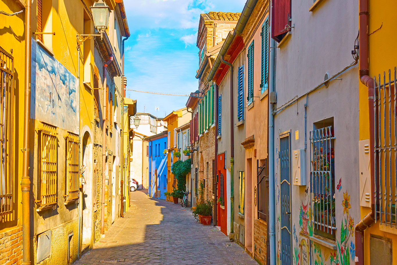 Borgo San Giuliano. To dawna dzielnica rybacka, położona tuż za Mostem Tyberiusza, która zachwyca klimatem wąskich uliczek, kolorowych domów i kwiecistych balkonów. Miejsce to stało się sławne dzięki Federico Felliniemu, który był z nim emocjonalnie związany; dziś fasady budynków zdobią liczne murale przedstawiające sceny z jego filmów oraz postacie znanych mieszkańców dzielnicy. Borgo San Giuliano to oaza spokoju, w której ukryte są liczne tradycyjne tawerny serwujące najlepszą piadinę i dania z ryb w mieście. Co dwa lata odbywa się tu barwne święto Festa de’ Borg, podczas którego dzielnica zamienia się w wielką scenę teatralną i biesiadną.