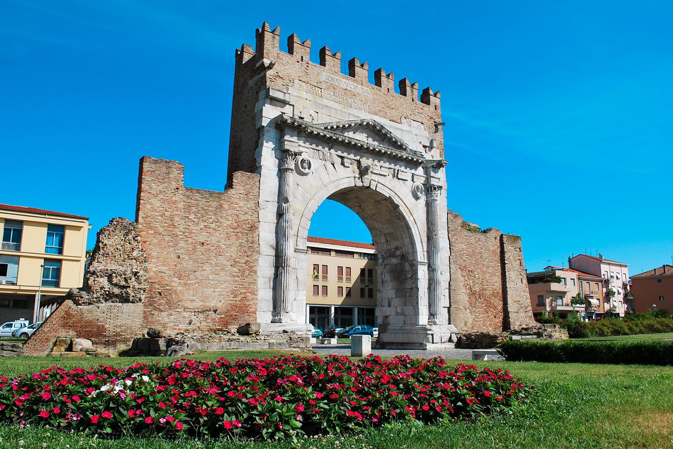 Łuk Augusta (Arco di Augusto). To najstarszy zachowany rzymski łuk triumfalny w północnych Włoszech, wzniesiony w 27 roku p.n.e. ku czci cesarza Augusta. Budowla stanowiła dawną bramę wjazdową do miasta dla osób przybywających od strony Rzymu słynną drogą Via Flaminia. Jego unikalna konstrukcja charakteryzuje się bardzo szerokim prześwitem, co miało symbolizować nadejście ery pokoju, w której bramy miasta nie musiały już być zamykane w obronie przed wrogami. Łuk jest ozdobiony medalionami z wizerunkami bóstw: Jowisza, Apolla, Neptuna i Minerwy, co dodaje mu dostojeństwa i przypomina o antycznej potędze miasta Ariminum.
